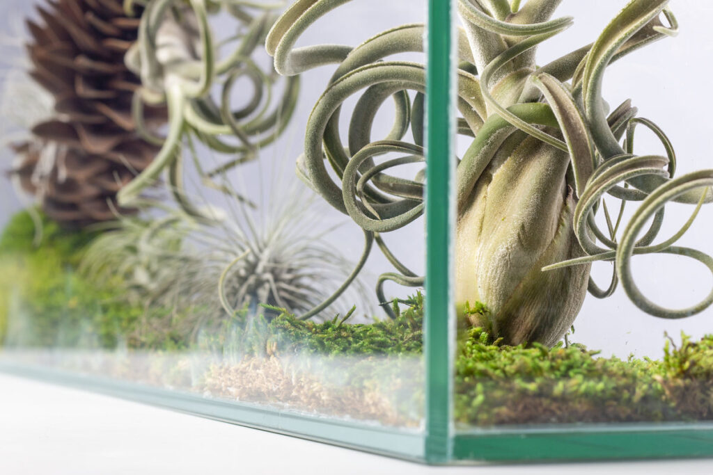 The plants remain visually alive without requiring water, light or maintenance.